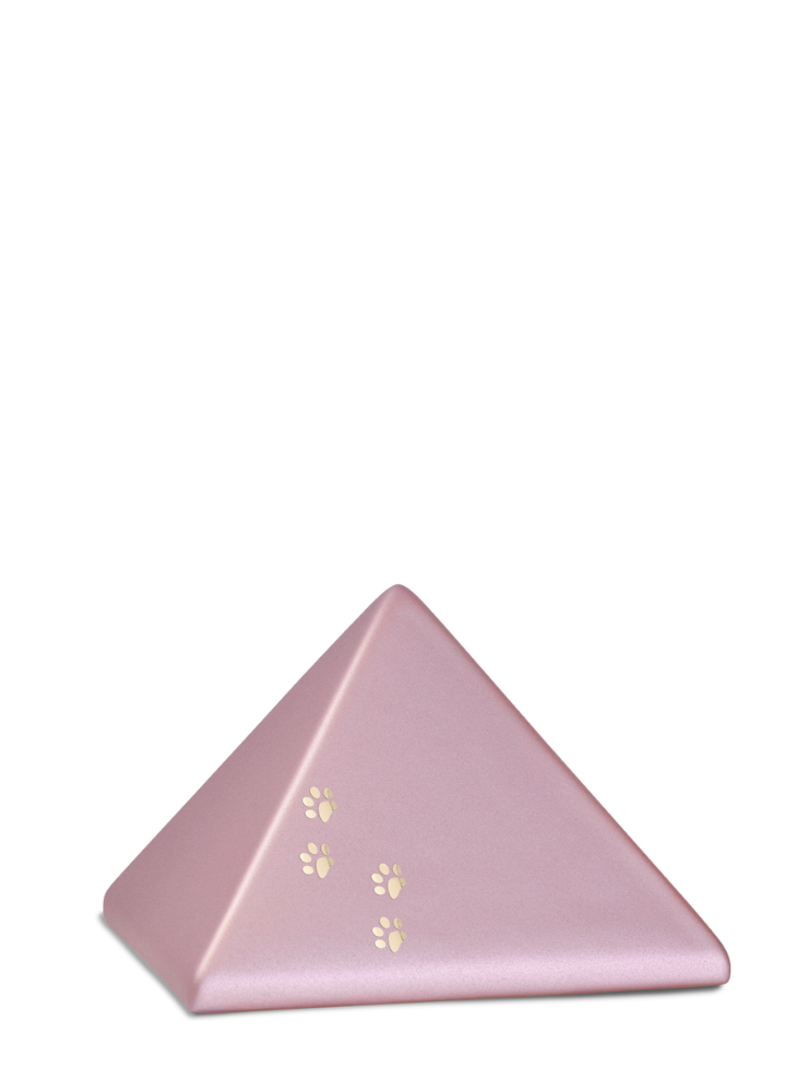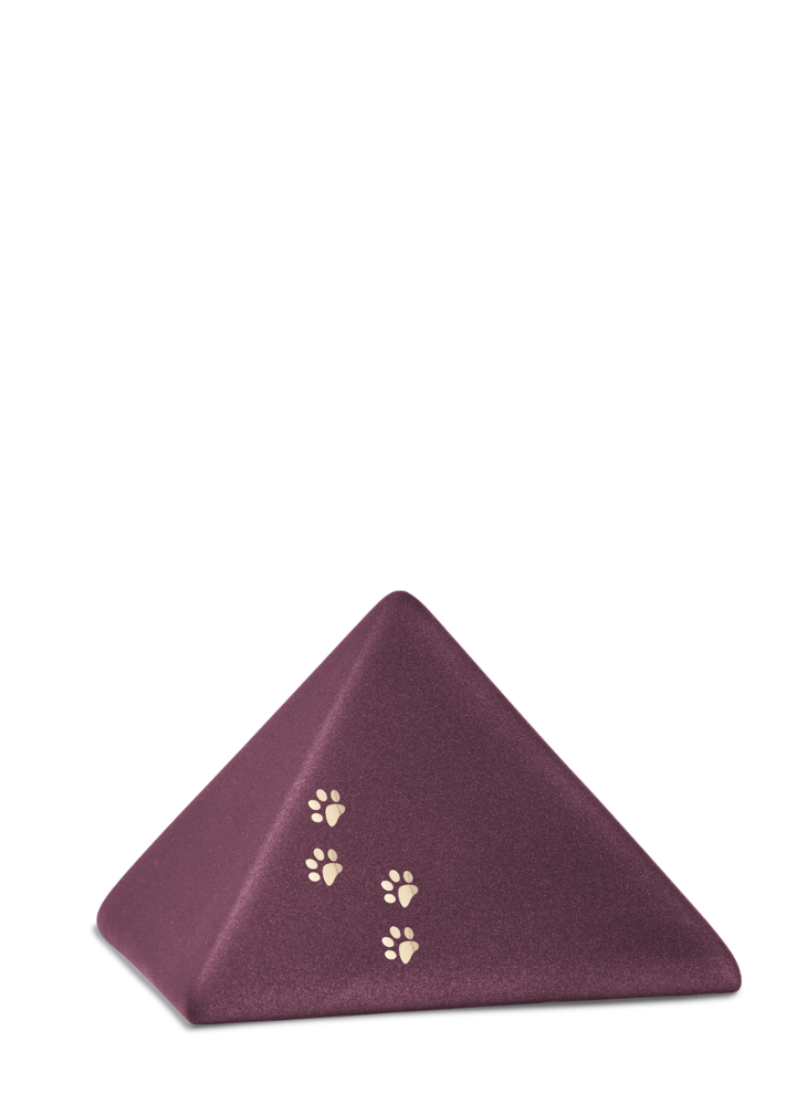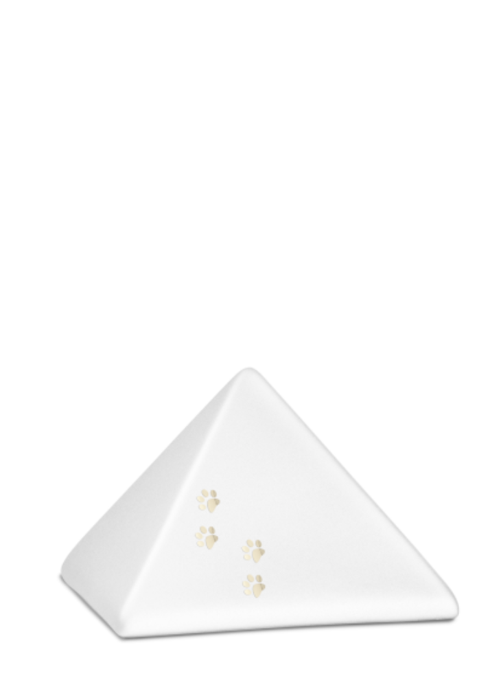 Keramická urna Pyramide Paws má matný, zamatový trblietavý povrch vo Vami zvolenej farbe zdobený zlatými lesklými labkami a je v tvare ihlana. Jej tvar jej dodáva neobvyklý vzhľad.